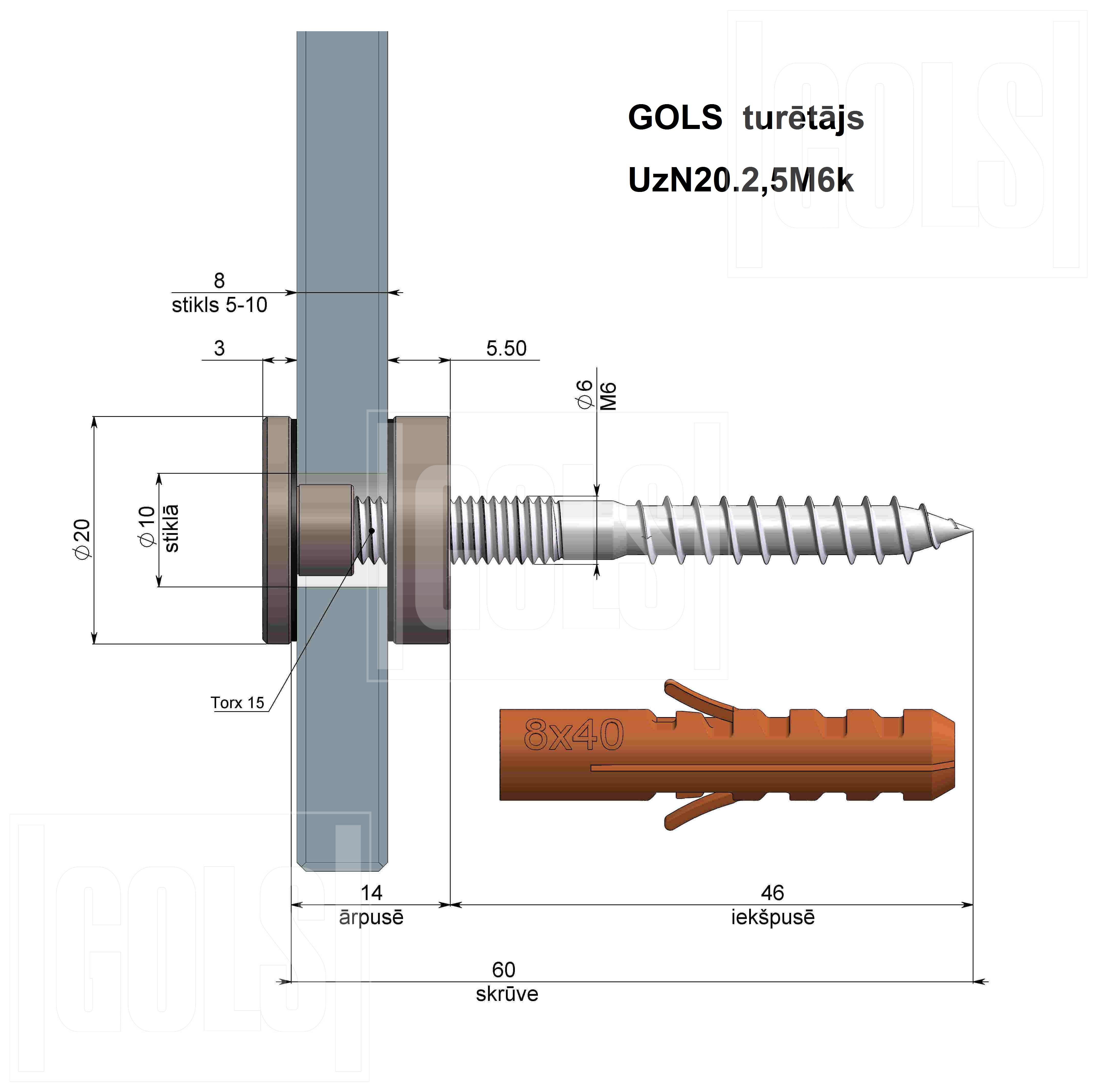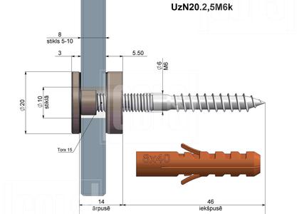 UzN20.2,5M6k turētājs ļauj ekonomiski un droši nostiprināt stikla vai jebkuru citu plakanu paneli uz koka, ģipša, betona virsmas jebkurā pozīcijā. Uzgriežņa priekšējā virsma ir dekoratīva. Izgatavots no nerūsējošā tērauda. Blīves ir gumijas, skrūve ir tērauda, cinkota. Skrūvi ieskrūvēt ar Torx15 gala atslēgu vai ar aklā uzgriežņa palīdzību.