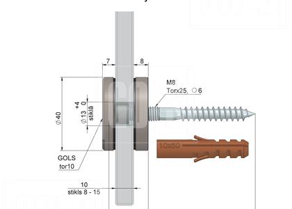 Turētājs UzN40M8k ļauj kvalitatīvi un droši nostiprināt stikla vai jebkuru citu plakanu paneli uz koka, ģipša, betona virsmas jebkurā stāvoklī. Ārējā paplāksnes virsma ir dekoratīva. Izgatavots no nerūsējošā tērauda. Blīves ir gumijas, skrūve-skrūve ir tērauda, cinkota. Kokskrūvi-skrūvi ieskrūvēt ar Torx25 gala atslēgu vai ar slēgtu (kurlo) uzgriezni palīdzību.